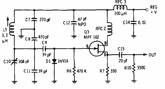 Encontramos este circuito en una documentación sobre FET de 1976. El circuito puede ser usado para oscilar en otras frecuencias con el cambio de L1. El circuito se puede utilizar para excitar etapas de mayor potencia en diversos tipos de aplicaciones como, por ejemplo, transmisores.
