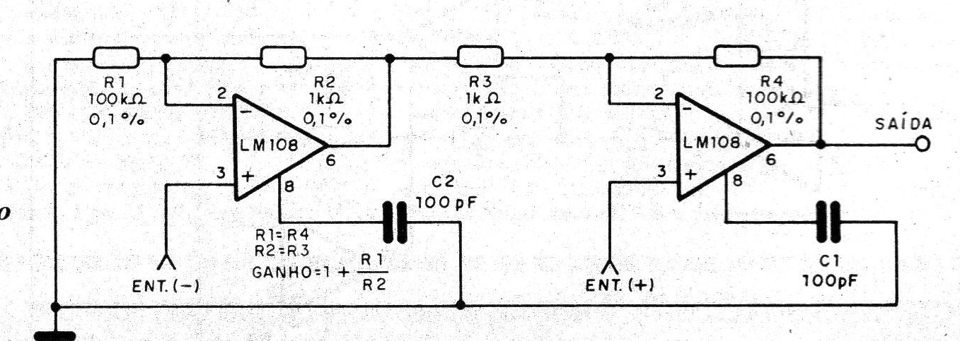 El circuito de la figura tiene por base dos integrados LM108 y su ganancia es determinada básicamente por la relación entre R1 y R2. La impedancia de entrada es de varios megohms, y los resistores usados, como en todos los circuitos de este tipo, deben tener una tolerancia bastante estrecha. Esta tolerancia, que determina el matrimonio de los componentes, influye en el rechazo en modo común. El capacitor C1 debe obtenerse experimentalmente para maximizar el rango pasante.