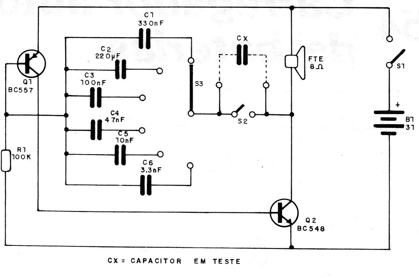 La idea de este capacímetro es comparar el sonido de un oscilador cuando usamos un capacitor de valor conocido y un capacitor desconocido. El circuito de una documentación de 1987 utiliza componentes comunes actualmente y es alimentado por pilas comunes. La precisión dependerá de la agudeza auditiva del lector y de la precisión de los capacitores usados.