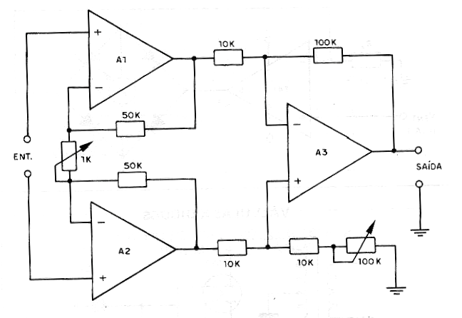Los amplificadores para instrumentación se caracterizan por tener una entrada diferencial y una elevadísima impedancia de entrada que se logra reduciendo la ganancia de la primera etapa, normalmente funcionando como seguidor de tensión. En el caso, tenemos un circuito con ganancia 1 000 dado por la segunda etapa de amplificación que presenta una baja impedancia de salida. La fuente de alimentación es simétrica y los amplificadores operacionales tanto bipolares como 741 como utilizando FET, tales como TL074 o TL084, se pueden utilizar.