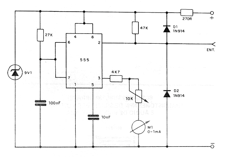 Este circuito sirve para medir la frecuencia de una señal formada por pulsos como, por ejemplo, generados por la rotación de un motor. El instrumento es un miliamperímetro de 0-1 mA, con su fondo de escala ajustado en el trimpot de 10 k. El resistor de 27 k y el capacitor de 100 nF se eligen de acuerdo con el rango de frecuencias a medir. Para este propósito se deben hacer cálculos de la frecuencia del monoestable que debe ser menor que la de los pulsos que deben ser medidos.