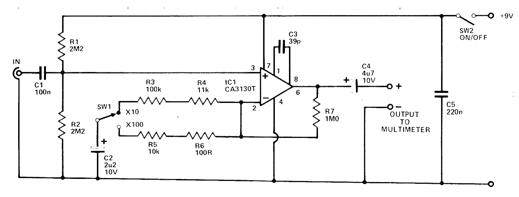 Este circuito aumenta la sensibilidad de un multímetro en la medida de señales alternas, señales de audio, por ejemplo. El circuito es de una publicación de 1979, pero puede ser montado con un CA3140 en lugar del CI original. La alimentación se realiza con una batería de 9 V. Las ganancias son seleccionadas por SW1.