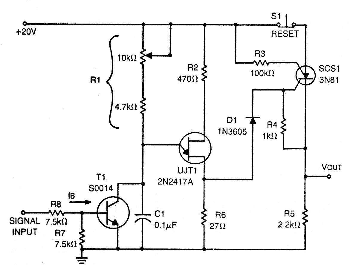 Hemos encontrado este circuito en una publicación técnica americana de los años 70. El circuito puede ser montado con componentes más modernos como el 2N2646 para el unijunción, BC548 para T1 y un SCR común, sin la necesidad de R3 en el circuito, como el TIC106. El circuito dispara proporcionando una tensión de salida cuando una señal desaparece de la entrada. El ajuste del punto de disparo se realiza en R1. La tensión de alimentación no es crítica, pudiéndose cambiar en función de los componentes usados.