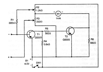 Los transistores de este circuito encontrado en una antigua documentación de los años 70 pueden ser los BC558. Lo que el circuito hace es aumentar la sensibilidad del instrumento, para operar con tensiones muy bajas. El instrumento puede ser sustituido por la escala correspondiente de un multímetro analógico común La alimentación se realiza con 3 pilas pequeñas y el consumo muy bajo. Los dos trimpots hacen el ajuste del punto de funcionamiento pudiendo tener valores estandarizados actuales más cercanos a los indicados.