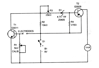 El transistor de este circuito encontrado en una antigua documentación americana puede ser el BC548 para T1 y BC558 para T2. El indicador puede ser un miliamperímetro o una escala baja de corrientes de un multímetro analógico. El trimpot de ajuste R3 puede ser de 22k o 47k y R1 puede ser de 4k7. Los electrodos son barras de metal que el interrogado debe sostener. La alimentación se realiza por batería de 9 V.