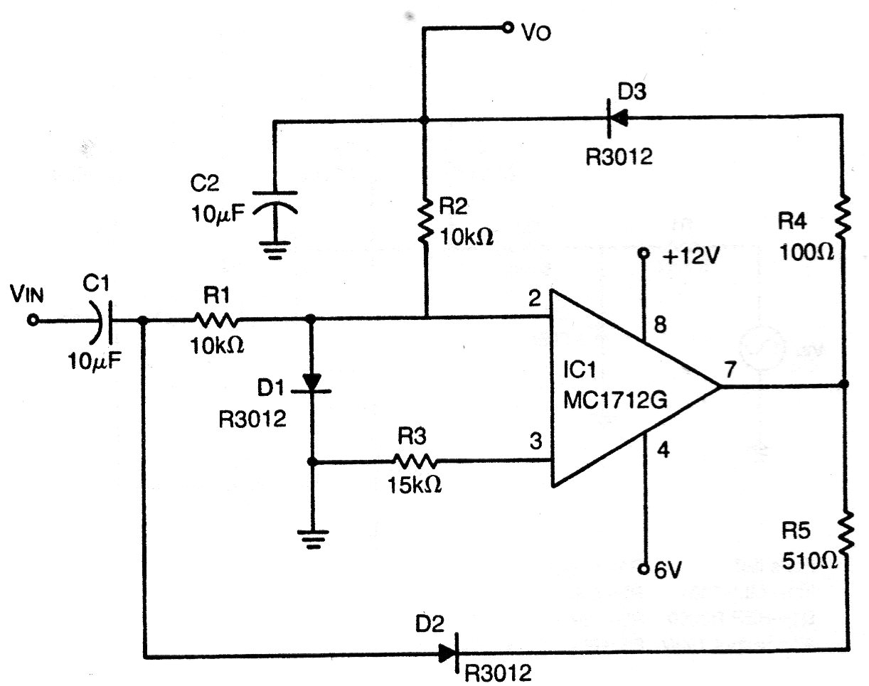 Encontramos este circuito en una documentación técnica de los años 70. Puede ser implementado con amplificadores operacionales más modernos. La fuente es de dos tensiones y la red R1 / R2 determina la tensión en que ocurre el disparo. Los diodos pueden ser de uso general.