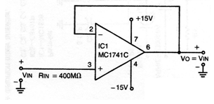 Esta es la configuración tradicional de un seguidor de tensión con el 741. El circuito es de una publicación antigua, pudiendo ser alimentado con tensiones más bajas. En un seguidor de tensión tenemos una impedancia de entrada muy alta, del orden de 400 M ohmios y una impedancia de salida muy baja. La ganancia de tensión es 1. El circuito puede operar con frecuencias de hasta 1 MHz aproximadamente.
