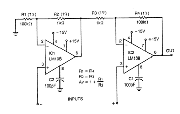 Este circuito es de una antigua publicación de los años 70, pero puede ser implementado con amplificadores operacionales más modernos. La fuente debe ser simétrica y dependiendo del amplificador usado, puede tener tensiones más bajas. La ganancia es dada por la relación entre R1 y R2. Los valores de estos componentes se pueden cambiar dependiendo de la aplicación. Cables de entrada y salida deben ser blindados como requiere este tipo de aplicación, muy sensible a ruidos.