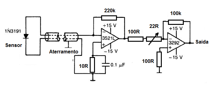 Este circuito utiliza un diodo de gran superficie para detectar radiación (partículas alfa y beta, además de rayos gamma). El circuito tiene bajo consumo y puede ser alimentado por batería. La salida se puede aplicar a un auricular de alta impedancia, un amplificador o un circuito integrador. Los amplificadores operativos equivalentes al original pueden ser experimentados, así como otros tipos de diodos sensores.