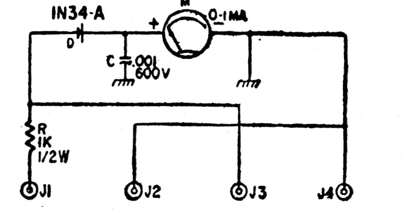 Este circuito, de una antigua publicación argentina, posibilita el uso de un miliamperímetro de 1 mA de fondo de escala en diversos tipos de medidas en la bancada. Se debe sólo cuidar en no sobrepasar los límites del instrumento, por ejemplo, con corrientes excesivas, lo que puede causar su quema. El uso del diodo posibilita el trabajo con tensiones alternas e incluso en la verificación del funcionamiento de osciladores y pequeños transmisores. El mismo circuito es válido para instrumentos de 100 uA con el cambio de R por un resistor de 4k7.