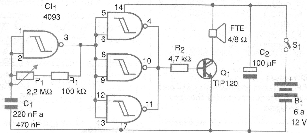 El circuito mostrado en la figura es una versión de alta potencia para un metrónomo, excitando un altavoz común. Con alimentación de 12 V podemos tener buen volumen con altavoz de 10 cm. El transistor debe estar dotado de un radiador de calor. Observamos que, con 9 o 12 V el consumo del aparato es algo elevado, siendo recomendado el uso de fuente con al menos 1 A de corriente. El ajuste de la frecuencia se realiza en P1 y C1 puede cambiarse según el rango de frecuencias que se va a producir
