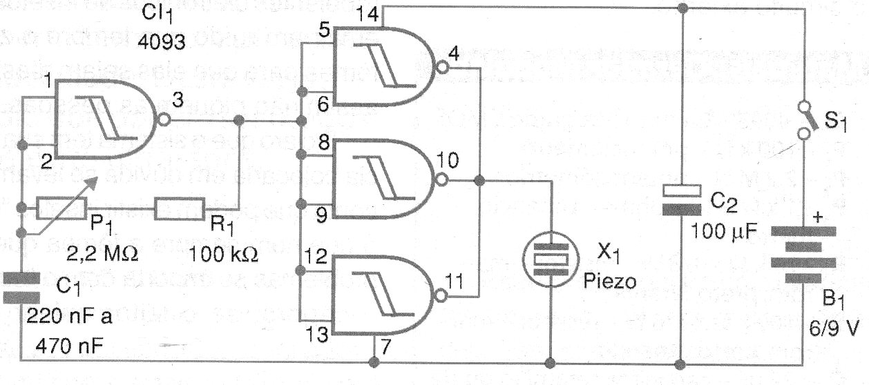 En la figura tenemos un circuito que produce pulsos intervalados, reproducidos en el transductor piezoeléctrico. La frecuencia de los pulsos se ajusta en P1 y depende básicamente de C1. El lector puede cambiar a voluntad el valor de C1. El transductor debe ser del tipo piezoeléctrico de alta impedancia. Para los tipos de baja impedancia o altavoz tenemos el siguiente circuito (metrónomo 2). La alimentación se puede realizar con tensiones de 6 a 12 V obtenidas de pilas, batería o fuente. El consumo es bajo, lo que garantiza una buena durabilidad para las pilas o la batería.