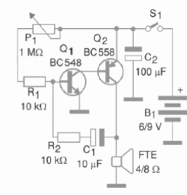 Esta configuración ya fue dada en diversos artículos y circuitos de este sitio y de publicaciones de Newton C. Braga. Este es el libro Scientre Fair Projects publicado en los Estados Unidos publicado en los Estados Unidos. El circuito puede ser alimentado por pilas o batería y para 12 V basta cambiar el Q1 por un BD136. El ajuste de frecuencia se realiza en P1.