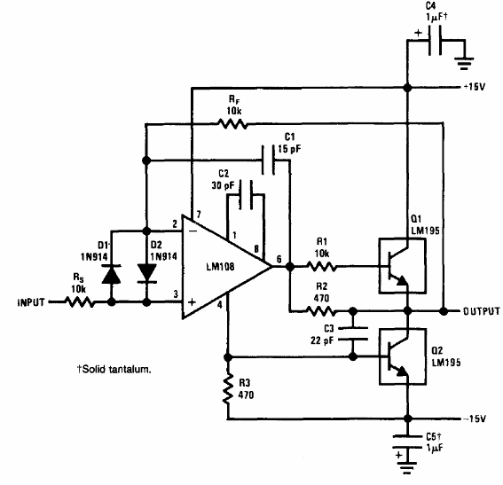 Este circuito hace uso de un transistor especial de potencia LM195 no muy fácil de obtener. El circuito es del Linear Applications Handbook de National Semiconductor de 1994.