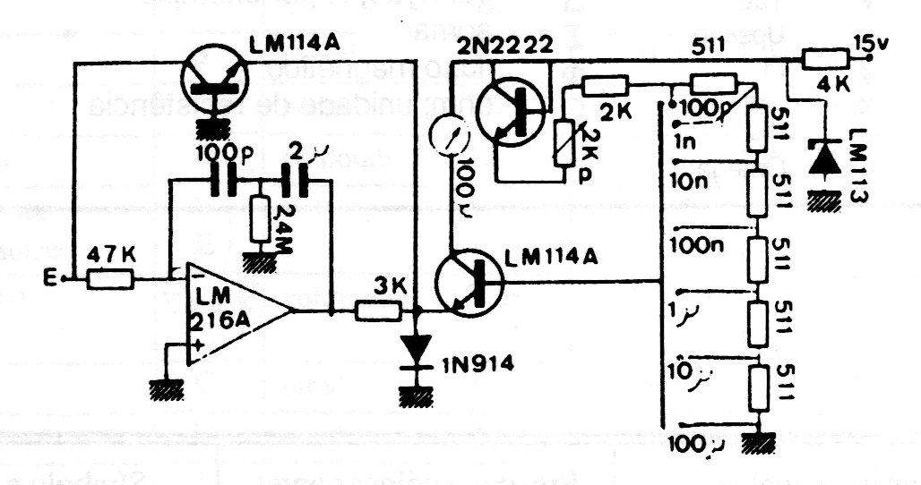 Este sensible microamperímetro fue encontrado en una documentación de los años 80. La precisión del circuito depende de la precisión de los resistores usados en el circuito de shunt. El instrumento de 100 uA puede ser sustituido por la escala más baja de corrientes de un multímetro común. Los transistores admiten equivalentes.