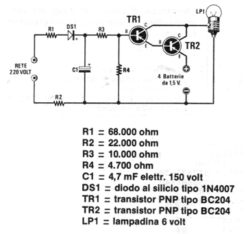 Encontramos este circuito en una antigua publicación italiana, pero se puede montar con transistores BC558 si la lámpara utilizada es de hasta 100 mA. Se pueden utilizar LED de blancos de alto rendimiento con resistores de 220 ohms si las pilas son de 6 V. El circuito también funciona en 110 V con la reducción de R1.