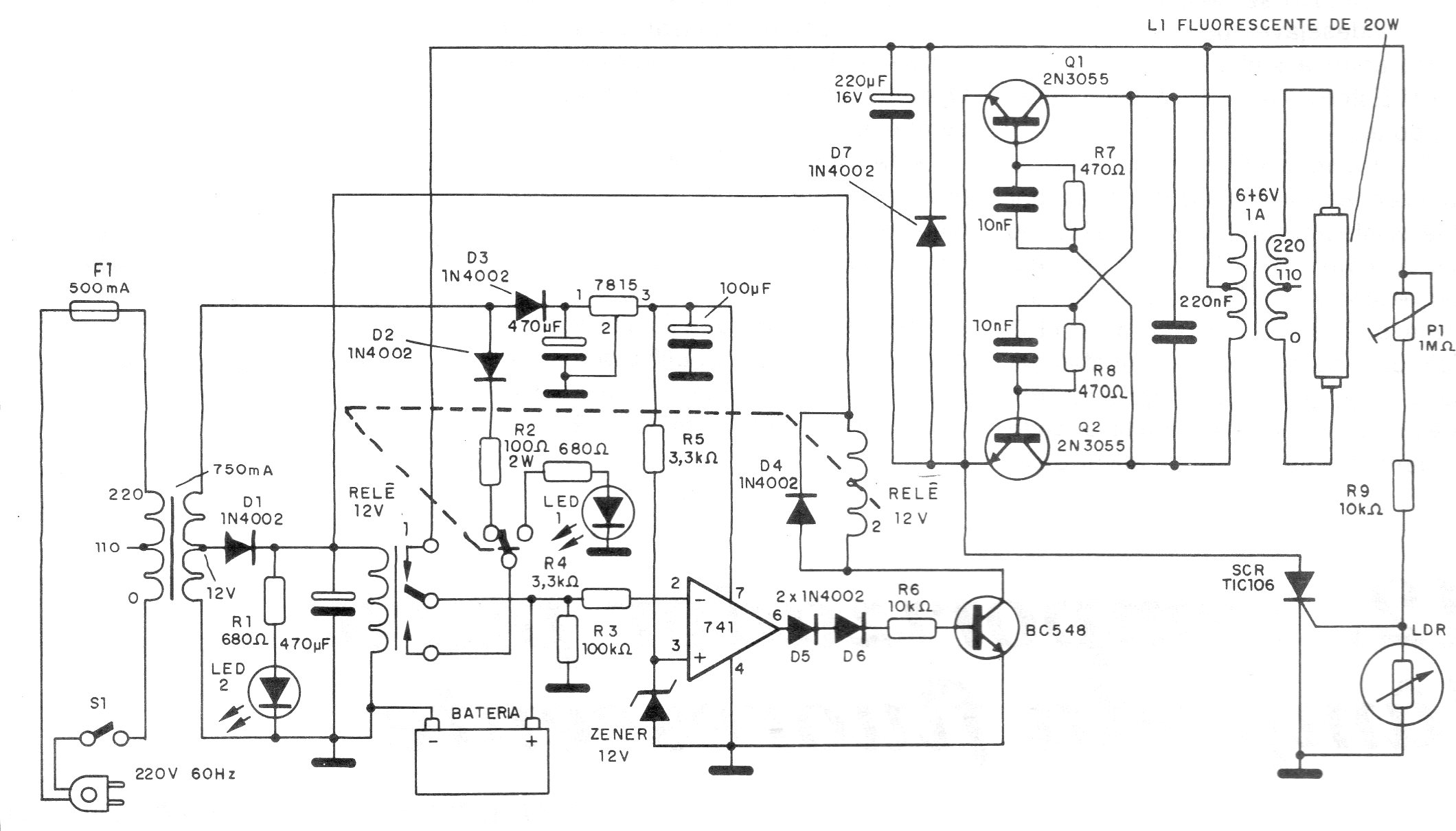 Este circuito incluye un sistema de carga de batería y un inversor para el accionamiento de una lámpara fluorescente. Encontramos el circuito en una documentación de 1994. Los transistores de potencia del inversor deben ser montados en disipadores de calor. La batería puede ser de cualquier tipo recargable de 12 V y según el tipo es el valor del resistor R2 que determina la corriente de carga. El valor dado es para una batería de coche. El ajuste del disparo del circuito en la oscuridad es hecho por P1.