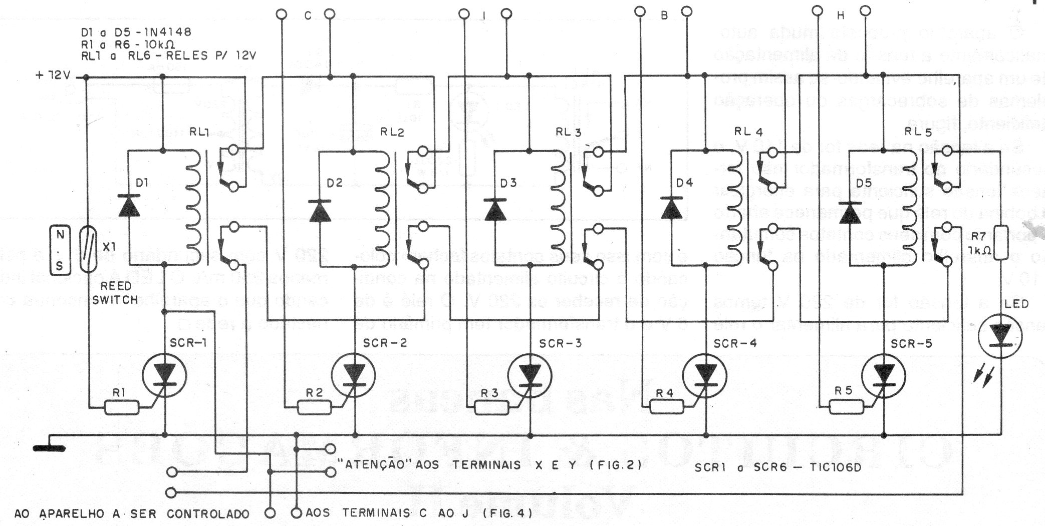 El accionamiento de cada SCR acciona el relé correspondiente en una secuencia tal que un relé sólo puede ser conectado si el anterior es accionado. Se pueden colocar los botones de accionamiento en un teclado con la programación de la contraseña que en este caso tiene 5 dígitos para el accionamiento inicial por un imán. Los relés son de 12 V. El circuito es de una publicación de 1993.