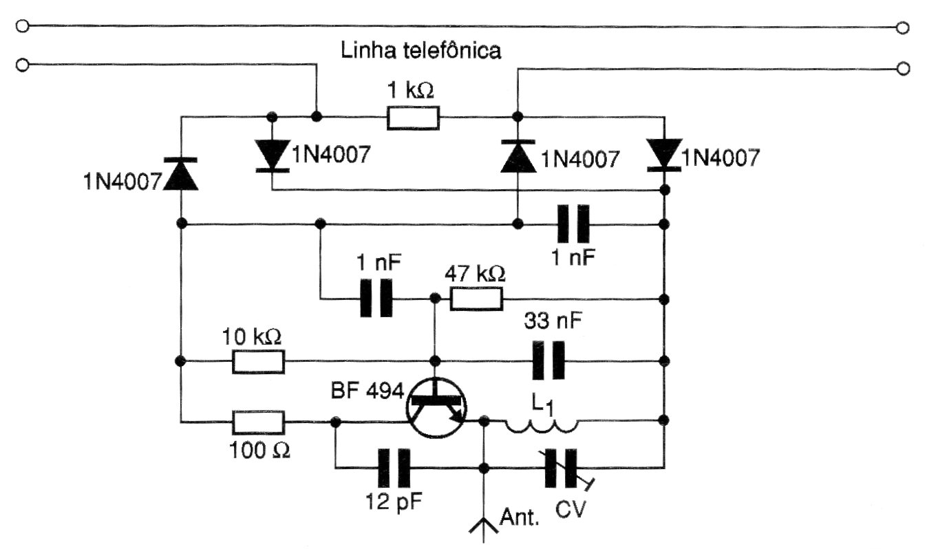 Este circuito transmite las señales de audio de una línea telefónica a un receptor de FM colocado cerca. La bobina tiene 4 espiras de hilo 28 en forma de 1 cm sin núcleo. El trimmer es común de 2-20 pF o mayor.