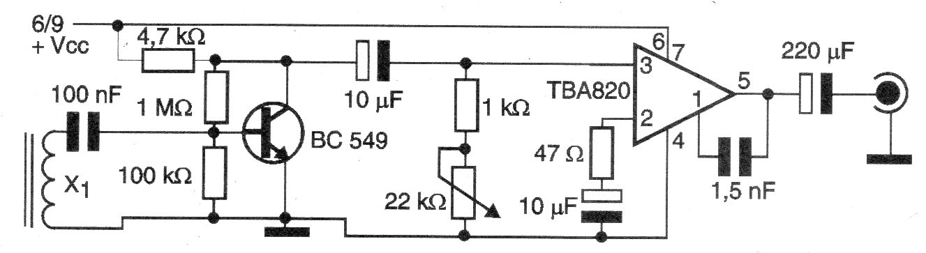 Describimos un sistema de escucha telefónica simple que no necesita ninguna conexión con la línea. Para operar el sistema basta aproximar la bobina captadora X1 de la línea, captando así las señales. Esta bobina es la llamada "maricota" usada por los radioaficionados brasileños para hacer la conexión de la línea en transmisores. También se puede obtener de los teléfonos antiguos y de los relojes despertadores. En el circuito, la bobina excita un transistor preamplificador que alimenta un amplificador de audio del tipo TBA820. El amplificador alimenta un altavoz o auriculares. Se pueden utilizar amplificadores integrados equivalentes en circuitos de acuerdo con el tipo como el TDA7052 o LM386. La alimentación para este circuito se puede hacer con 4 o 6 pilas comunes.