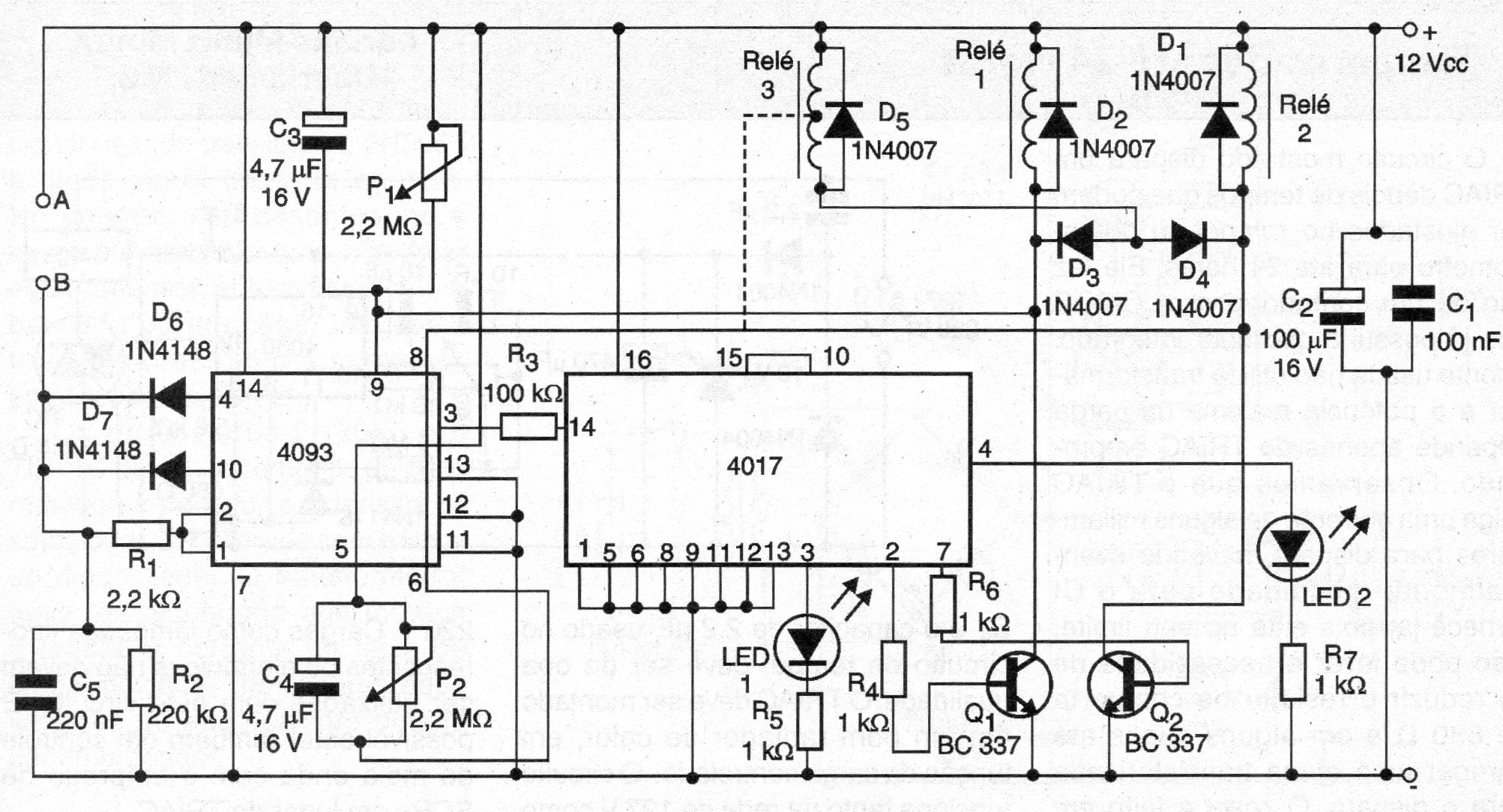 Encontramos este circuito en una documentación de 2005. El circuito posibilita la automatización de una puerta a través de relés sin el uso de llaves de final de carrera. El accionamiento es hecho por llaves colocadas entre A y B. El circuito debe ser alimentado por fuente de alimentación de 12 V. Los tiempos de apertura y cierre se ajustan en P1 y P2.
