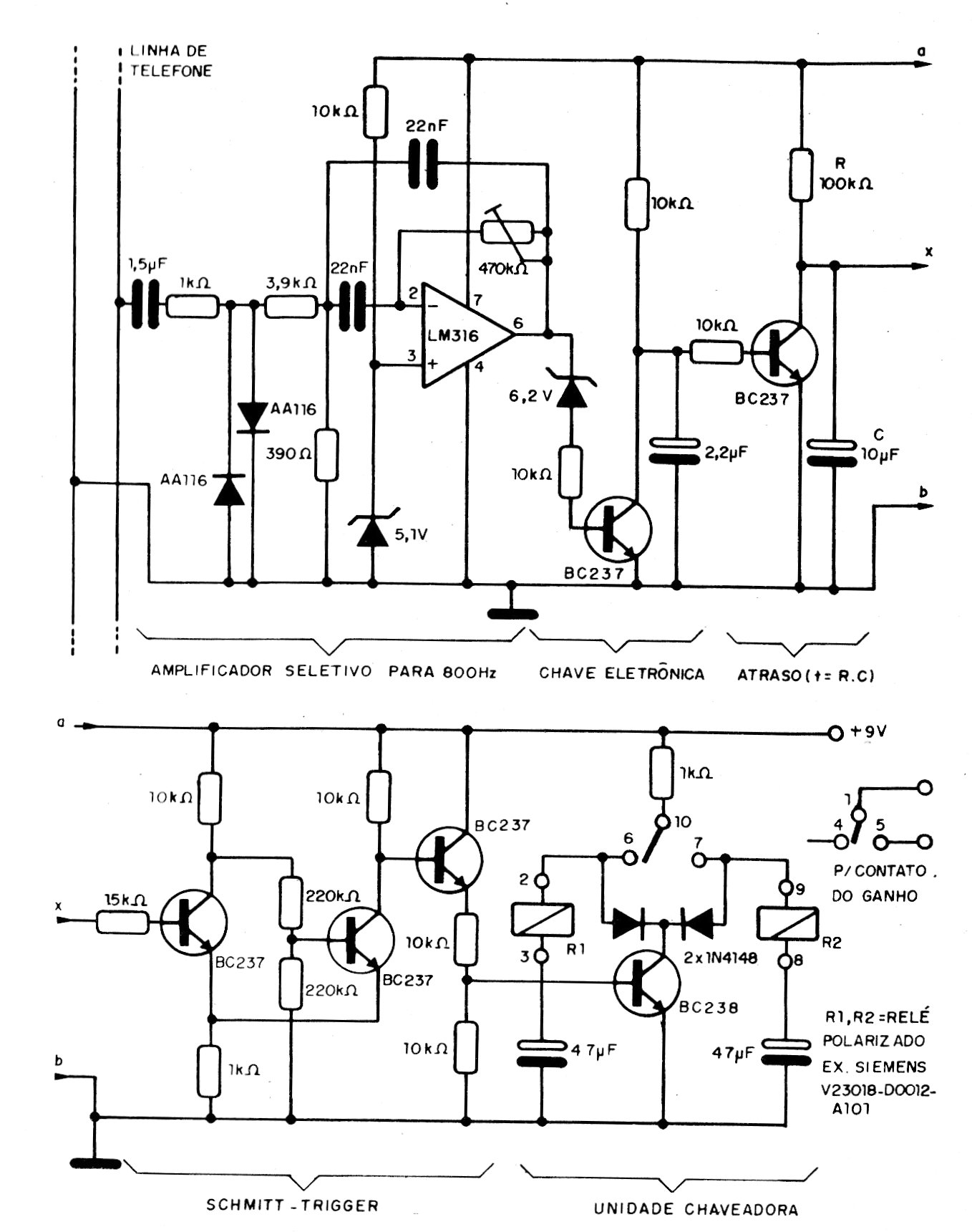 Encontramos este circuito de escucha telefónica en una publicación de los años 90. El circuito permite que el cable entre el punto de interceptación y la escucha sea muy largo. El circuito también tiene un sistema de accionamiento automático. Los transistores admite equivalentes así como el amplificador integrado.