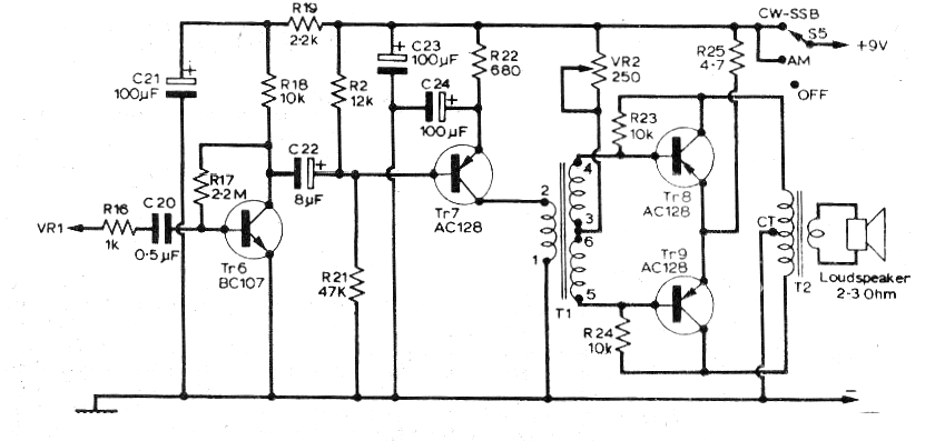 Este circuito tiene mucho más un valor histórico que práctico, a menos que el montador encuentre los componentes todos en la etapa de salida de un viejo grabador de cassette de los años 70 o una radio de la época. El circuito fue obtenido de una Revista Inglesa de 1975 y consiste en un amplificador que proporciona algo entre 1 y 2 W de buen audio con alimentación de 9 V. Este circuito formaba parte de un receptor, de ahí la llave AM / CW-SSB que puede ser eliminada. El montador puede encontrar los componentes antiguos de este circuito en chatarra de aparatos de la época y así, retirarlos con cuidado para hacer el montaje en una placa nueva y utilizar como amplificador reforzador para MP3 y otras aplicaciones modernas. Los transistores usados en la época son todavía de germanio, de la serie AC muy populares en la época. Utilice la fuente en la alimentación, ya que el consumo es algo alto para la batería.