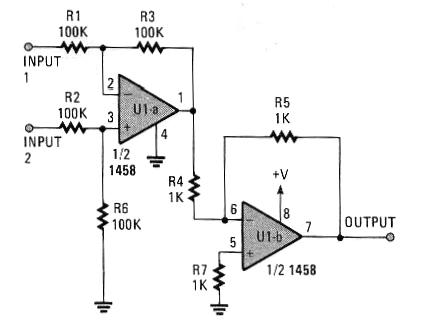 Este circuito fue sugerido por la revista Popular Electronics en la edición de enero de 1993. En él, la tensión de salida es dada por la diferencia entre las tensiones de entrada. En la sección de matemáticas para electrónica, los cálculos para este tipo de circuito. El MC1458 o simplemente 1458 consiste en un doble 741. La fuente de alimentación no necesita ser simétrica si las tensiones de entrada son positivas. Las tensiones de entrada no pueden ser mayores que la tensión de alimentación.