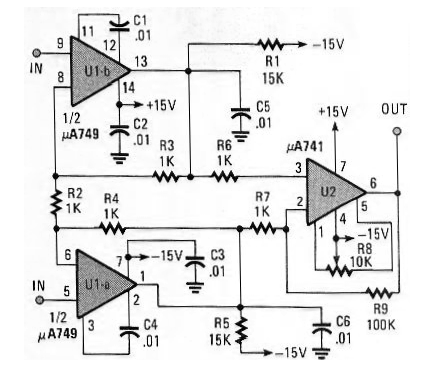 Este circuito fue sugerido por la revista Popular Electronics en la edición de enero de 1993. Este tipo de circuito por su elevadísimo ganancia e impedancia de entrada es normalmente usado en instrumentación. El amplificador uA749 no es muy común, pero se pueden utilizar equivalentes. Cualquier buen amplificador operacional debe funcionar. Tenga en cuenta que la fuente de alimentación debe ser simétrica. El circuito amplifica la diferencia entre las tensiones aplicadas a las entradas.