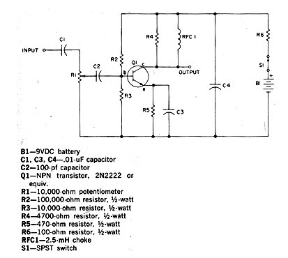 En circuito presentado puede amplificar señales de audio o RF de hasta unas decenas de megahertz. El circuito es de baja potencia sirviendo normalmente como preamplificador de antena, de audio y en otras aplicaciones. El consumo es muy bajo y RFC1 se utiliza sólo en el caso de la operación con señales de RF (por encima de 1 MHz). R1 funciona como un control de sensibilidad o volumen.