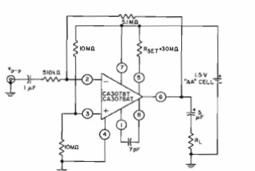 Este circuito es de un antiguo manual de circuitos integrados lineales de la RCA, de 1972, pero puede ser montado con equivalentes más modernos y con valores de componentes estandarizados actuales. La fuente es de baja tensión, de acuerdo con las características del operacional utilizado.
