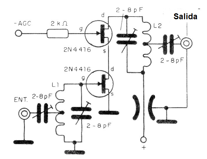 Este circuito es de una documentación especializada en FETs de 1992. La bobina L1 tiene 0,07 uH con toma central y L2 tiene 0,07 uH con toma en ¼ de las espiras del lado de tierra. Se pueden utilizar transistores equivalentes. La alimentación se realiza con tensiones de 9 a 12 V.
