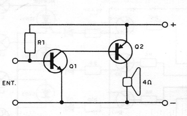 Al sacar el altavoz, este amplificador utiliza sólo 3 componentes: dos transistores y una resistencia. Por supuesto, se trata de un amplificador de prueba, dada su baja potencia, pero puede ser usado como seguidor de señales, previendo para ello un condensador de aislamiento en la entrada, o aún como etapa de salida para raditos de cristal o receptores simples . La resistencia es de ¼ W o 1/8 W y puede tener valores entre 2M2 y 4M7. El valor será elegido según la ganancia deseada, en función del nivel de señal, para que no haya distorsión ni exceso de consumo, lo que será percibido por el calentamiento de Q2. El altavoz puede ser tanto de 4 como de 8 ohmios y la alimentación entre 3 y 6 V. El transistor NPN puede ser el BC549C o cualquier equivalente como el BCS48, BC238 o BC239. El transistor PNP (Q2) puede ser un BD136, BD138 o BD140. Para utilizar como etapa de mayor potencia, en la salida de una radio FM, por ejemplo, con alimentación de 6 V, la resistencia puede reducirse a 1M, pero el consumo será del orden de 500 mA, lo que requiere el uso de disipador para Q2.