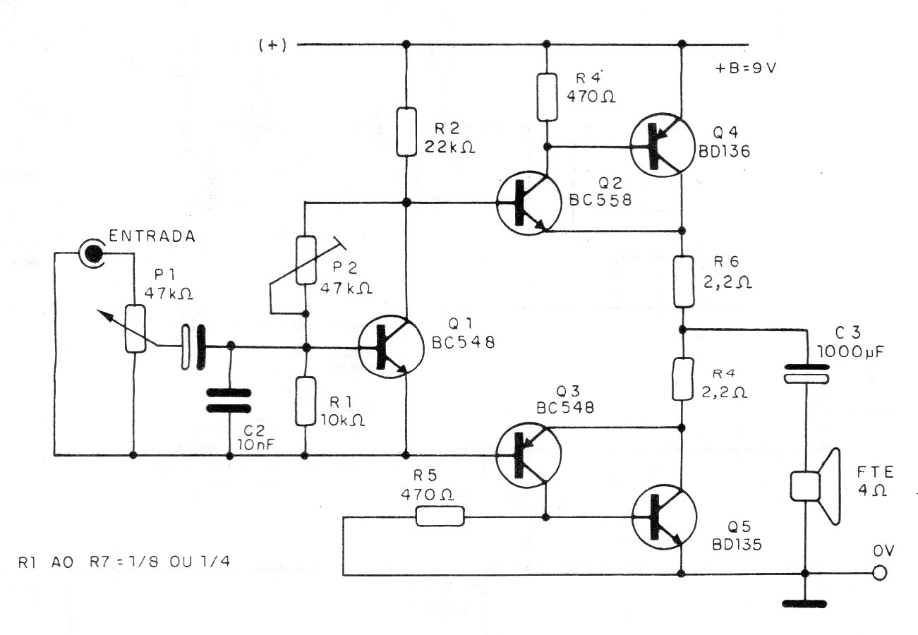 Cuando está alimentado por una tensión de 9 V este pequeño amplificador proporciona una potencia de algunos vatios a un altavoz. El circuito fue encontrado en una documentación de 1993 pudiendo ser utilizado como amplificador de prueba para la bancada. Los transistores de salida deben estar dotados de pequeños disipadores de calor.