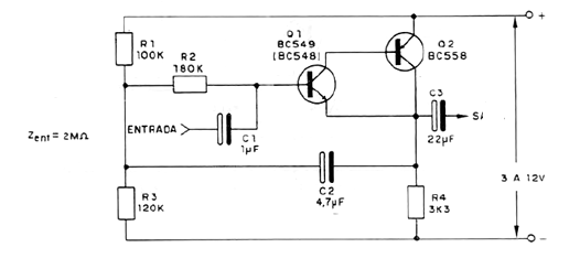 La impedancia de entrada de este paso amplificador es de 2 M ohms lo que la hace ideal para aplicaciones con transductores piezoeléctricos y otras fuentes de señales débiles. Se puede utilizar para conectar las entradas analógicas de un Arduino con señales de audio. El circuito puede ser alimentado con tensiones de 3 a 12 V y como el consumo es muy bajo, se pueden utilizar pilas o baterías.