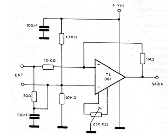 Este circuito es una aplicación para un amplificador operacional con transistores de efecto de campo de Texas Instruments y está destinada a la amplificación de señales de bajas frecuencias (audio) con excelente rendimiento. El resistor de 1M junto con los resistores de 10k de entrada determina la ganancia mientras que la impedancia es 50 ohmios. El trimpot hace el ajuste de la simetría de la señal, actuando sobre la tensión de offset de salida. La alimentación se puede realizar con tensiones de 1,5 a 12 V.