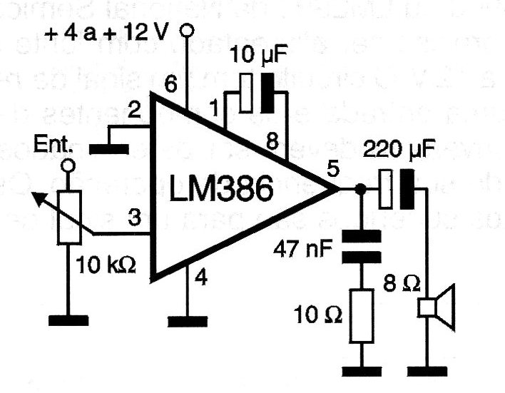 Precisando un pequeño paso amplificador para un intercomunicador, radio u otro tipo de aparato alimentado por pilas o tensiones hasta 9 V, este circuito es el ideal. El circuito integrado LM386 puede suministrar hasta 500 mW en cargas de 8 ohmios y tiene una excelente ganancia de tensión. El control de volumen consiste en un potenciómetro de 10 k ohms y el capacitor entre los pinos 1 y 8 programa la ganancia de tensión.