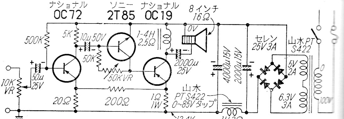 Este amplificador de baja potencia, con 2 W en carga de 16 ohms, fue encontrado en una revista japonesa de los años 60. El circuito utiliza transistores de la época y tiene una fuente de alimentación con transformador. El transformador tiene secundarios de 5 y 6 V con 2 A. El transistor de potencia debe montarse en un disipador de calor.