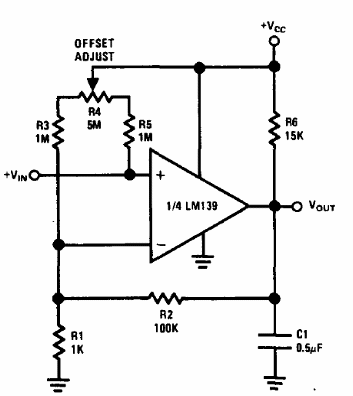 En la figura tenemos el modo de realizar el ajuste del offset de entrada en un amplificador con ganancia 100 usando un comparador LM139. El circuito es del Linear Applications Hanbook de National Semiconductor.