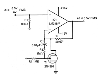 Esta configuración de amplificador operacional tiene la ganancia controlada por una tensión externa aplicada a un transistor de efecto de campo. El transistor puede ser el BF245 y el operacional puede ser el 741, incluso con otras tensiones de alimentación. La ganancia puede ser variada entre 1 y 100 según la tensión de entrada varía entre 0 y Vcc. El resistor de 220k (22k) se puede cambiar a otras bandas de ganancia.