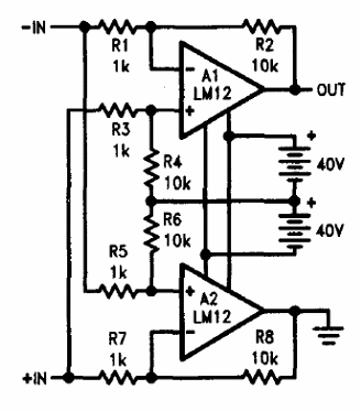 Esta configuración muestra cómo utilizar dos amplificadores de 4 A de National Semiconductor en puente. El circuito es del Linear Applications Handbook de 1994.