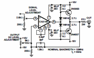 Este amplificador fue obtenido en el propio datasheet del CA3140, amplificador operacional con JFET en la entrada, originalmente creado por la RCA. Los transistores pueden ser los BC548 y BC558 y la fuente de alimentación debe ser simétrica. El circuito tiene dos ajustes y el rango pasante es de 10 MHz.