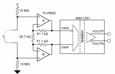 Este circuito fue obtenido del datasheet del TLV8002 de Texas Instruments de 2017. El circuito muestra cómo conectar un termopar a un aislador con ganancia de tensión para un circuito externo. El circuito tiene un rango pasante de 1 MHz y contiene filtros de RF y EMI; El circuito opera con termopares de 1 M ohm a 50 M ohms.