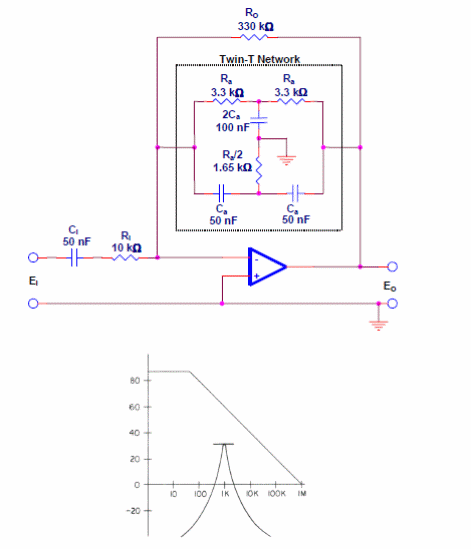 Este circuito es de un application note de Texas Instruments de 2016. El circuito utiliza un operacional común y sus características son dadas por el doble T en el eslabón de realimentación. Para los valores de los componentes indicados la curva de respuesta está centralizada en 1 kHz como muestra el gráfico junto al diagrama.