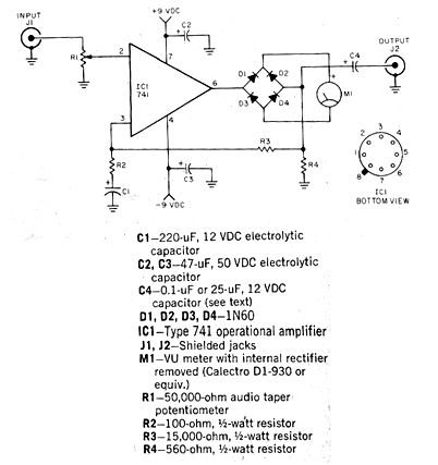 El circuito mostrado, tiene un indicador de señal y excita una línea de 500 ohmios a partir de señales de un micrófono de alta impedancia (50 k ohmios) u otra fuente de señal. El circuito del 101 Electronics Circuits de 1976, tiene la curiosidad de indicar el pináculo de un 741 y envoltorio metálico redondo, lo que ya no existe más en nuestros días ... La fuente debe ser simétrica y los demás componentes todavía pueden ser obtenidos. El VU puede ser un microamperímetro de 200 uA.