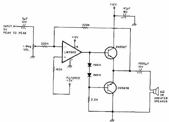 Este circuito está destinado a la amplificación de señales de instrumentos musicales electrónicos. Encontramos en una publicación de 1977. Los transistores de salida pueden ser los BD135 y BD136 dotados de radiadores de calor. La fuente de alimentación no necesita ser simétrica.