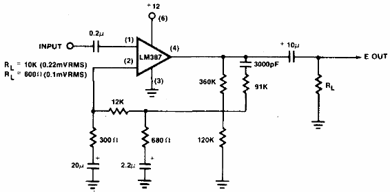 Este circuito, de una publicación técnica de la Signetics de 1977, puede ser usado en la recuperación de medios, para su transferencia a computadoras y otros medios. El circuito tiene una ganancia de 81 dB y una salida de 22 mV rms en carga de 10k.