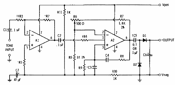 Este filtro decodificador fue encontrado en una documentación de 1975. Los circuitos integrados pueden ser los 741. El circuito se utiliza con teléfonos que deben ser alimentados por una fuente simétrica. C3, C4, R8 y R9 determinan la frecuencia a ser reconocida.