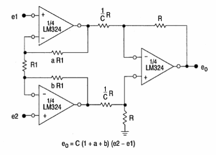 Este amplificador para instrumentación fue encontrado en el Motorola Linear Interfaz IC, un handbook de 1993. El circuito requiere una fuente de alimentación simétrica y la impedancia de entrada es muy alta.