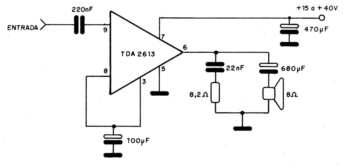 El amplificador presentado es ideal para ser utilizado en pequeños sistemas de sonido monofónicos, radios o televisores alimentados por la red de energía, intercomunicadores, etc. El circuito integrado TDA2613 es fabricado por Philips Componentes y debe estar dotado de un buen radiador de calor. Este circuito no necesita una fuente de alimentación simétrica y la ganancia de tensión es elevada, lo que requiere cuidado con el blindaje de los cables de entrada de señales.